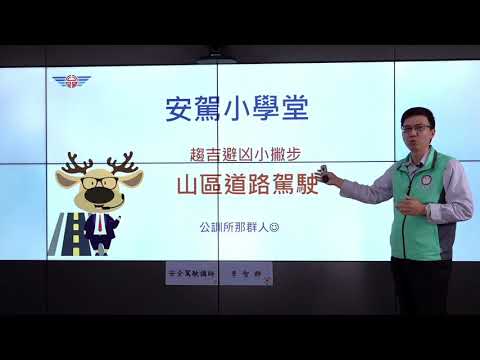 山區道路駕駛~趨吉避凶小撇步本日講綱1.山區多霧,開燈、以路面邊線為指標來行駛:儘量開車窗,探視車外訊息。2.山區行駛減速慢行很重要:行近彎道減速駛入,待彎道快終止時,再加速。避免車速過快,致車輛偏離車道。道路受山壁阻擋形成視野死角時可輕鳴喇叭,利用路邊反射鏡確認來車。3.上下坡會車時要注意:下坡車應禮讓上坡車;靠山壁車輛應讓道路外緣車優先通過。 4.長下坡請儘早放低速檔:下陡坡或長距離下坡時應以低速檔行駛。不可連續過度踩煞車,以免產生煞車來令片過熱退化之現象。(大型車善用輔助煞車)5.善用道路旁輔助設備,發現煞車性能不良或衰退時應提早停車檢修。